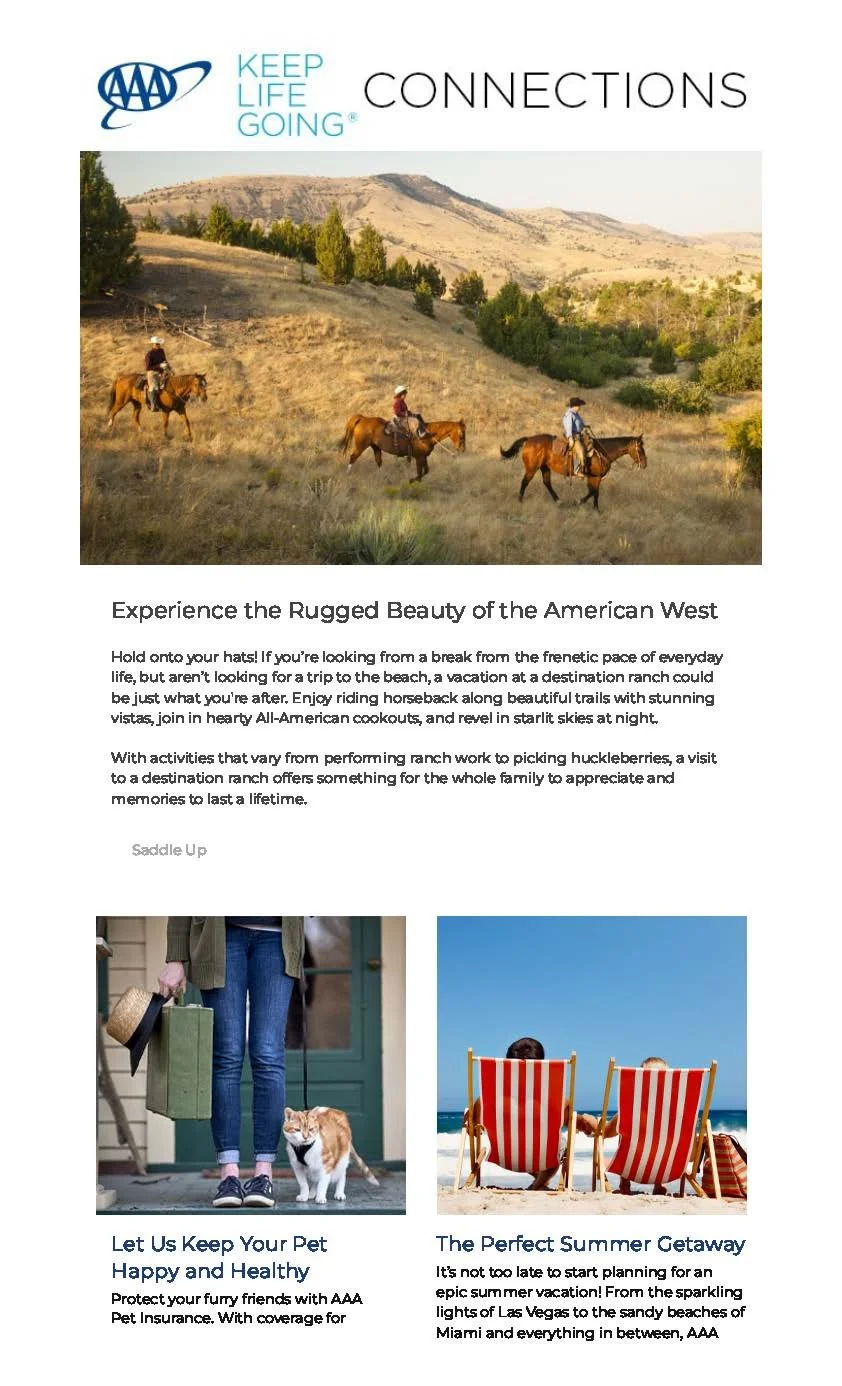 I create the graphics for AAA newsletters. I build for regularly scheduled sends (discounts, auto, insurance, travel, and connections) and one-off sends, like this unique Black Friday hero image featuring AAA Travel partners.
